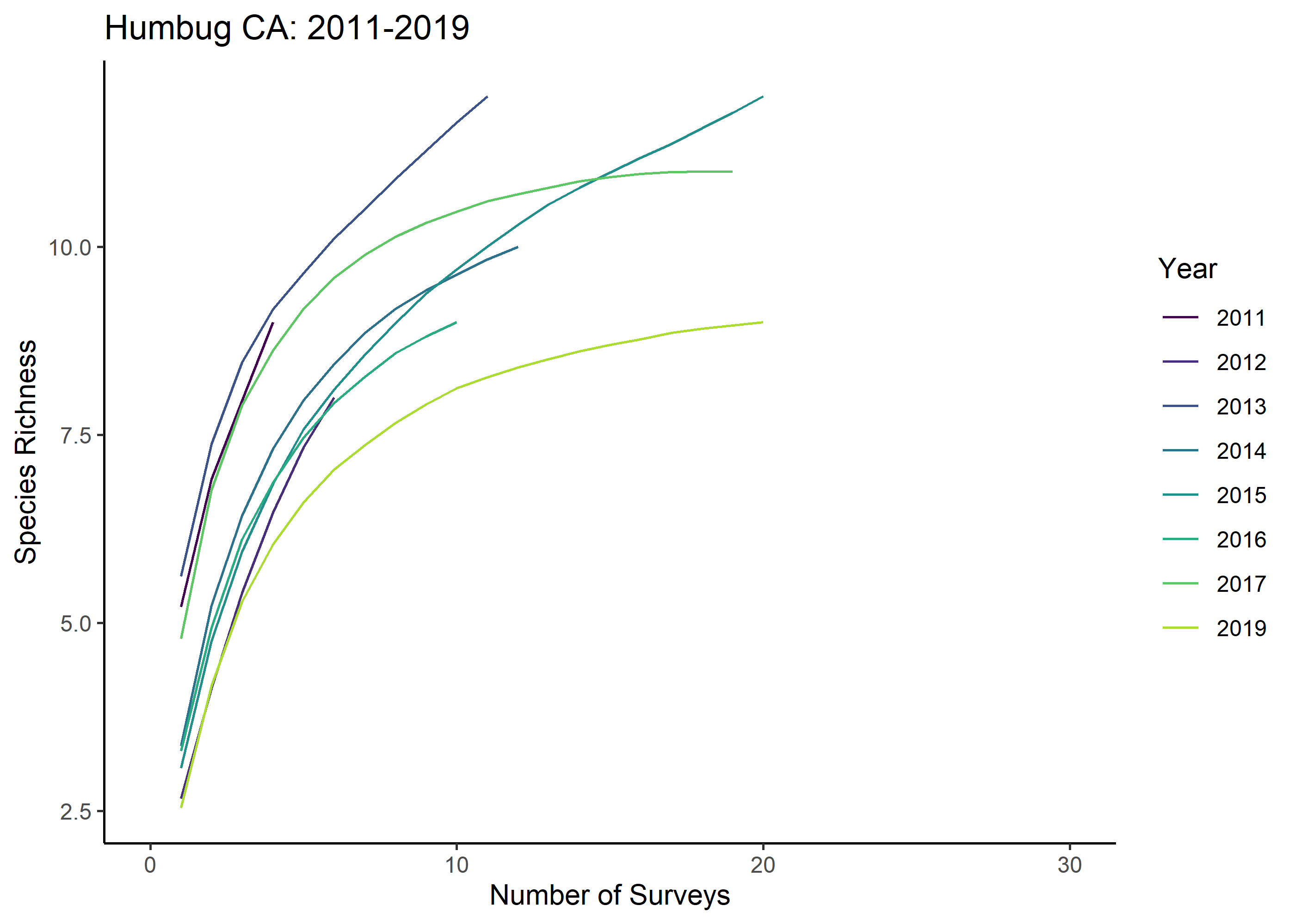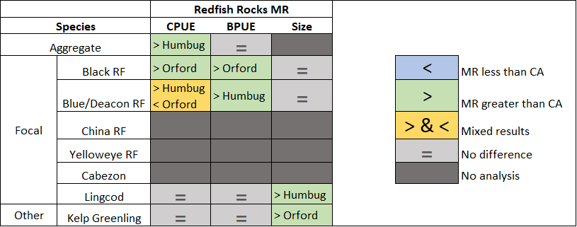 Our HnL sampling began at the Redfish Rocks Site in 2011, one year before harvest restrictions began. Sampling is conducted in the marine reserve and two comparison areas, Humbug and McKenzie Reef (see methods Appendix for additional information about comparison area selection). We sampled at the Redfish Rocks site in 2011 - 2017 and in 2019, providing eight years of data for our analysis and inclusion in the synthesis report.