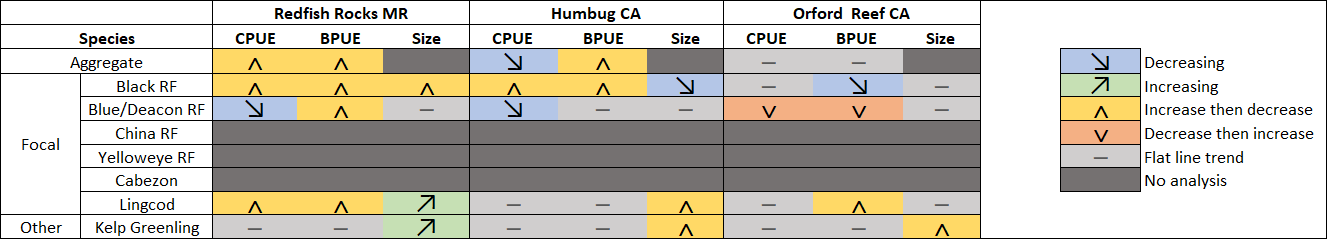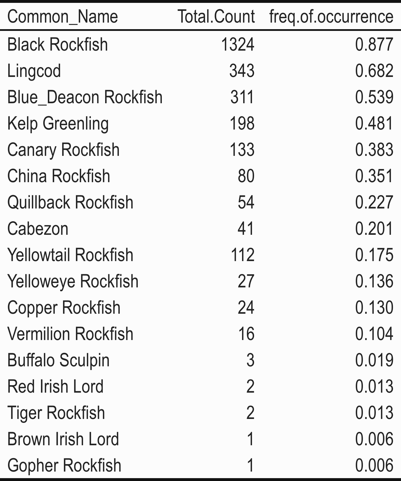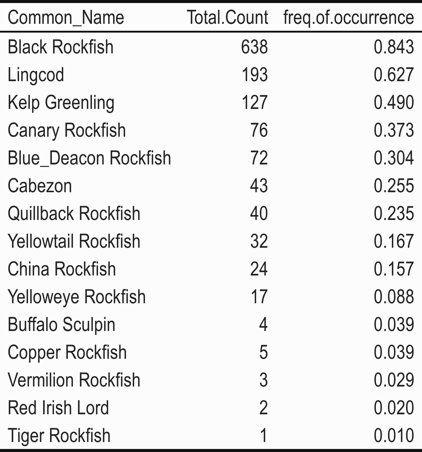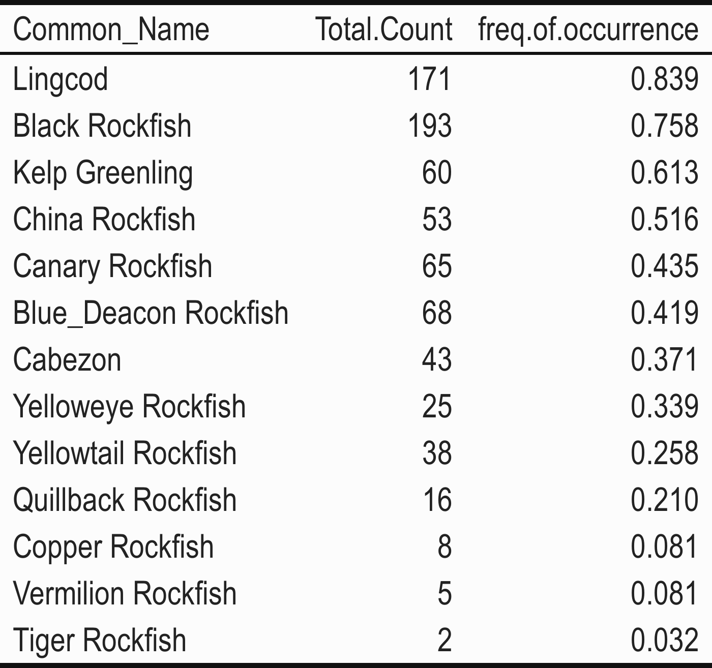 Data from hook and line monitoring efforts can be used to explore questions about fish abundance and size from a method that is similar to local commercial nearshore hook and line fishing efforts. We can also explore these data with questions about diversity and community composition to compare across monitoring tools to understand tool bias or to validate trends seen across tools. This can further help us understand how the fish communities at these sites are similar or different. Data on abundance and size enable us to explore how fish catch, biomass, and size have changed over time; and whether these changes are similar both inside the reserve and outside in comparison areas. For all data our main focus is exploring trends by site and year.