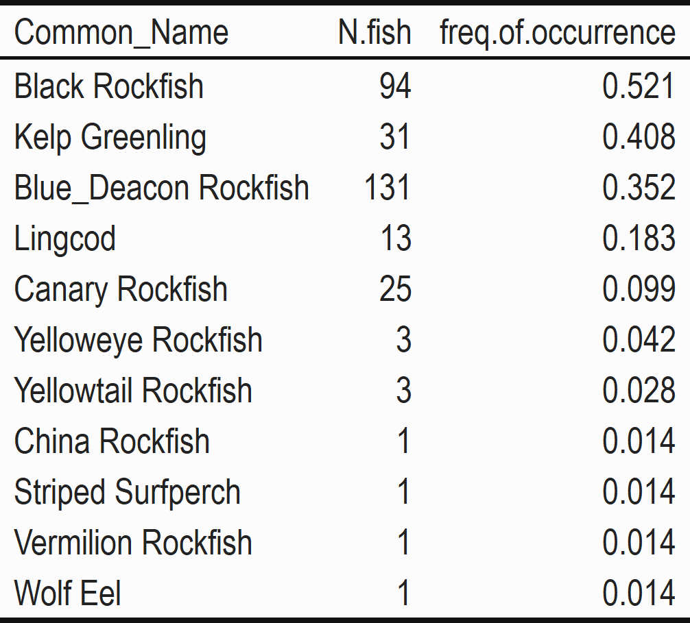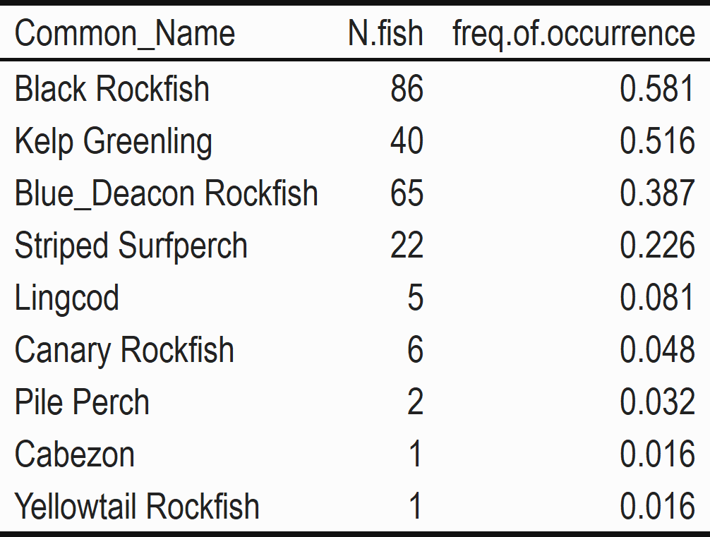 Data from lander monitoring efforts can be used to explore questions about fish relative abundance from a non-extractive, fisheries-independent tool used elsewhere in Oregon and the US West Coast. We can use metrics for diversity and community composition derived from these data to compare across monitoring tools, to understand tool bias, or to validate trends in relative abundance observed across tools. Data on relative abundance also enables us to explore how fish communities change over time; and whether these changes are similar both inside the reserve and outside in comparison areas. For all data our main focus is exploring trends by site and year.
