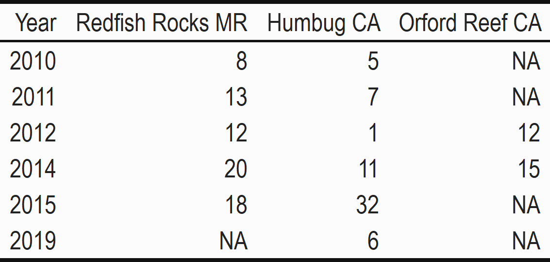 Lander sampling began at the Redfish Rocks in 2010, two years before harvest restrictions began. Sampling is conducted in the marine reserve and its associated comparison areas, Humbug and Orford Reef (see methods Appendix for additional information about comparison area selection). We sampled at these sites over several years, with varied levels of success in achieving usable data - data that met requirements for view, visibility, and benthic habitat type (rocky substrates). These efforts results in six years of usable data for our analysis and inclusion in the synthesis report.