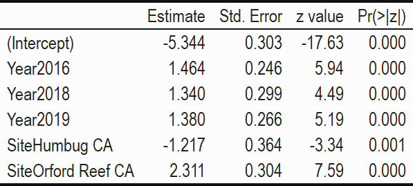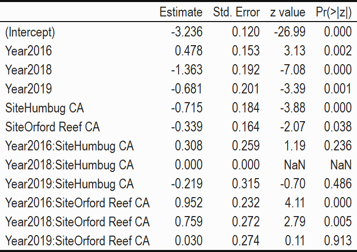 Where significant Site * Year interactions were identified, we did not pursue further lower-level analyses comparing individual years or sites. Rather we restricted our inferences to the significance of each factor level identified in the GAM’s output table, which treated the Redfish Rocks Marine Reserve as the reference level of Site against which the other sites were compared, and 2010 as the reference year against which other years were compared. All analyses were conducted in R (R Core Team (2021)). GAM models of individual species densities were implemented in package “mgcv” v. 1.8-35 (Wood 2011).