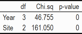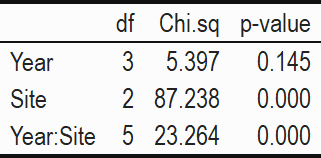 In certain cases, loss of species precluded analysis across all years. In this situation, models were run on individual years’ data. In other cases, certain species were not sufficiently abundant at a given site to warrant inclusion in the statistical analyses. In these cases, the site in question was dropped from the analysis if the data violated the required assumptions.