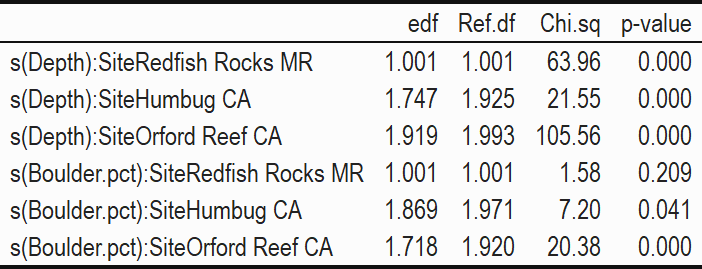 Rock Scallop density had distinct relationships with depth at the Redfish Rocks Marine Reserve (increasing fairly linearly) and the Orford Reef Comparison Area (peaking very slightly at mid-depths) (p < 0.05, Fig. 16, Table 24). Rock Scallop density decreased with increasing percent boulder at the Orford Reef Comparison Area but the smooth effect for boulder was not significant at the other two sites.