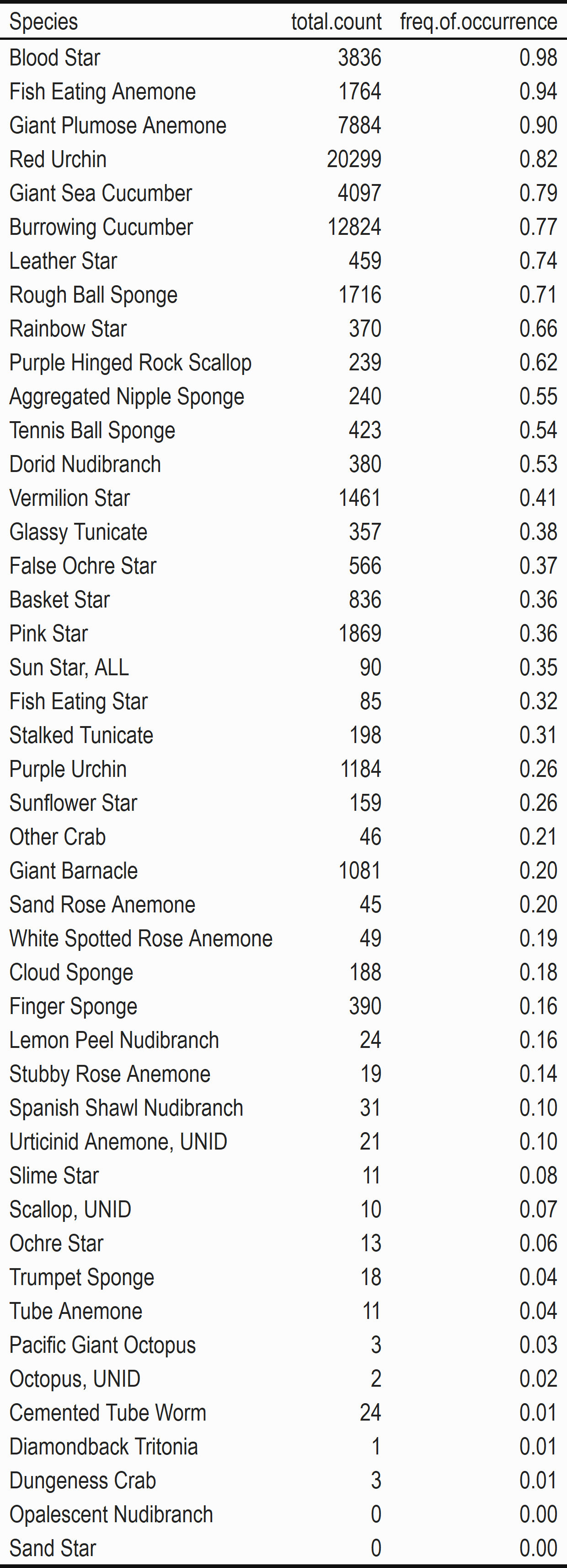 Table 4: Redfish Rocks Marine Reserve Pooled Species Counts and Frequency of Occurrence