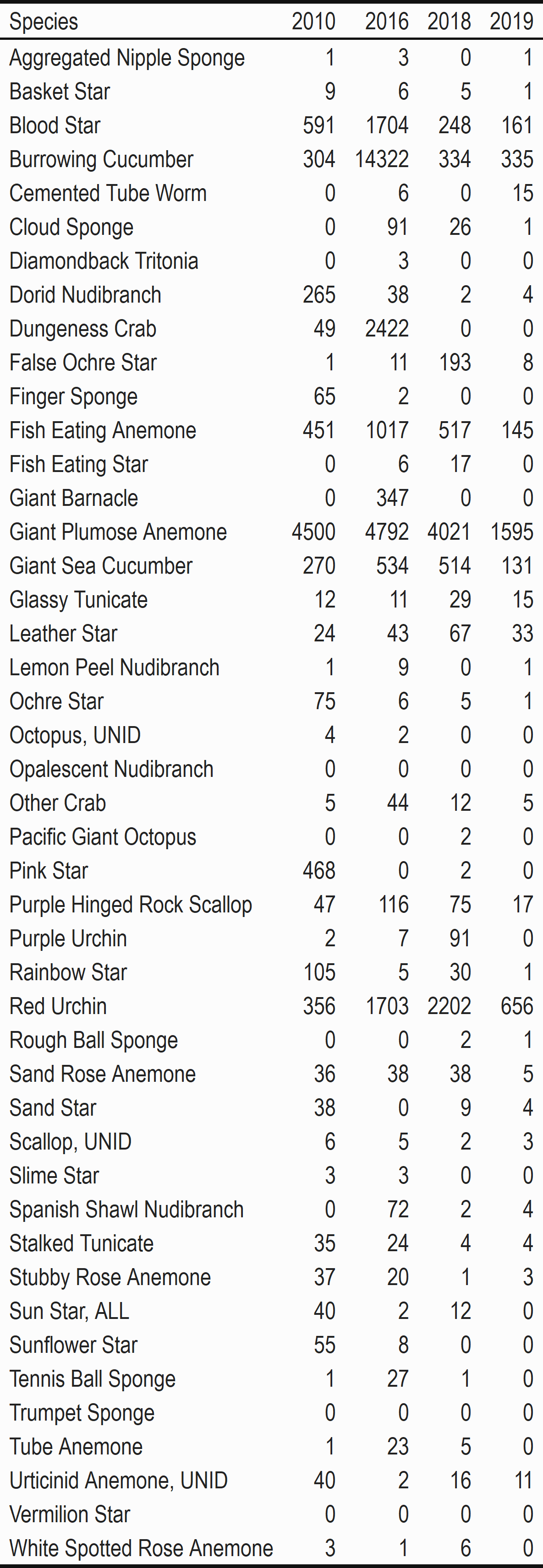 The Sunflower Star was eradicated by the Seastar Wasting Syndrome that devastated seastar communities across the West Coast starting in 2013 and 2014. Total counts were reduced to zero in 2019 (Table 15).