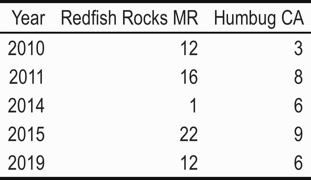Our SCUBA invertebrate sampling at Redfish Rocks began in 2010, two years before harvest restrictions began. Sampling is conducted in the marine reserve and one comparison area, Humbug (see methods Appendix for additional information about comparison area selection). We conducted five years of sampling at both sites, providing five years of data for our analysis and inclusion in the synthesis report.