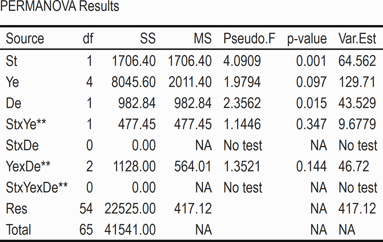To test the statistical significance in our data of variation by site and year we ran a permutational analysis of variance (PERMANOVA), using a mixed model with site and year as fixed effects factors. Initial explorations of the first two years of data resulted in no apparent trends by depth between the two target depths, therefore depth was considered a random effect, and nested under site. To explore if any significant results of the PERMANOVA were related to true differences in location or differences in dispersion of samples (either by site or year to year), we ran a PERMDISP, a distance based test for homogeneity of multivariate dispersions for any factors that were significant in the PERMANOVA (Anderson and Walsh 2013). If a factor was significant in the PERMANOVA but not the PERMDISP, then it can be inferred that the significance is related to a location effect, but not a dispersion effect. If the factor is also significant in the PERMDISP, then significance in the PERMANOVA is related to dispersion, but there may also be a location effect.