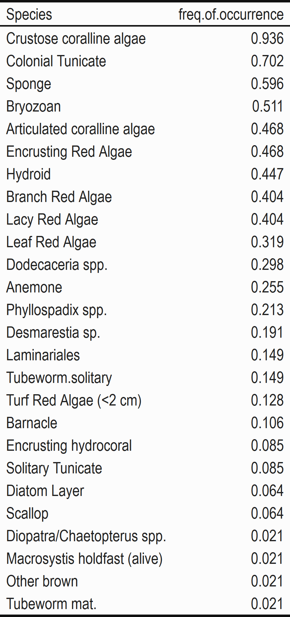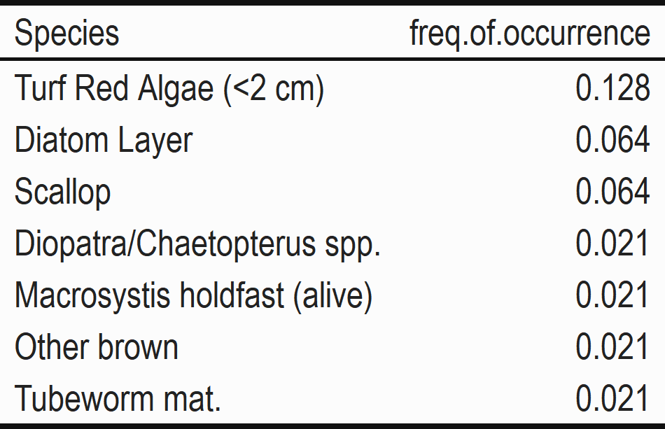 Many of the other benthic species were not observed frequently resulting in low frequency of occurrence. Not all species were observed each year, for a summary of species frequency of occurrence over the years by site please see tables below.