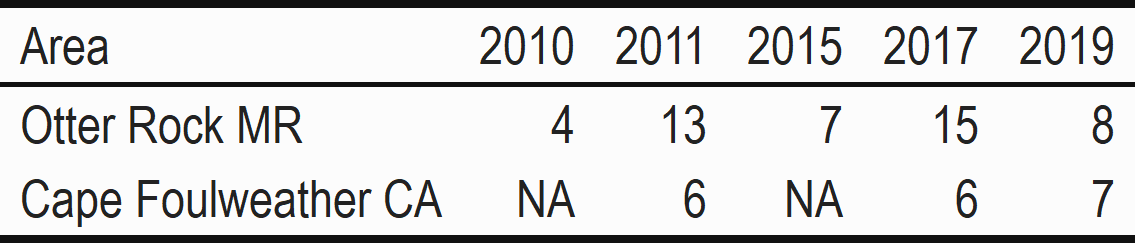 The Otter Rock Marine Reserve had more unique species (n = 7) than the Cape Foulweather Comparison Area (n = 4) (Table 8). The Otter Rock Marine Reserve (n = 4) had similar common species than the Cape Foulweather Comparison Area (n = 5). Two of the four common species in the marine reserve were also found to be common in the Cape Foulweather Comparison Area (Table 8). The Otter Rock Marine Reserve had more rare species (n = 8) than its comparison area (n = 5).