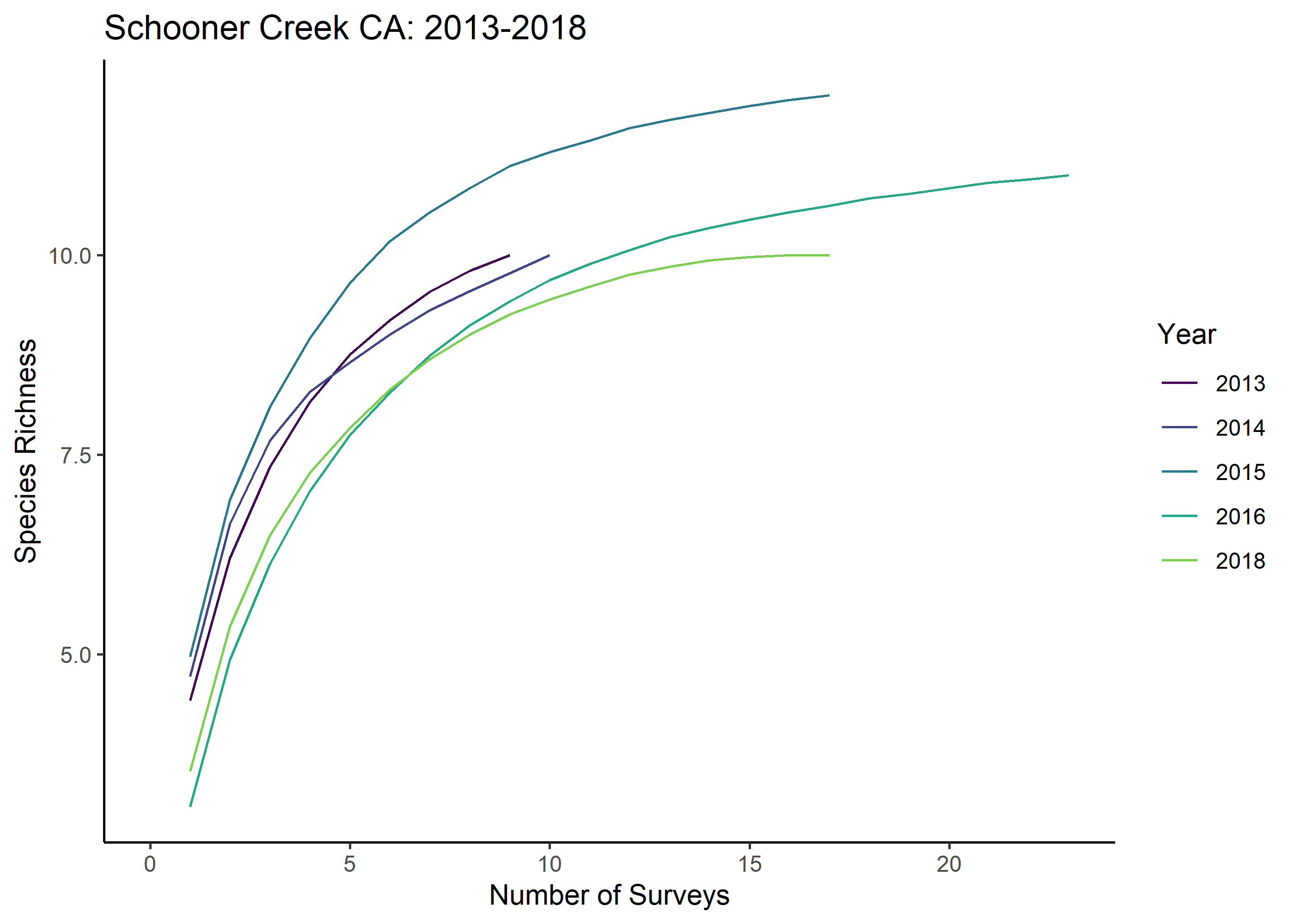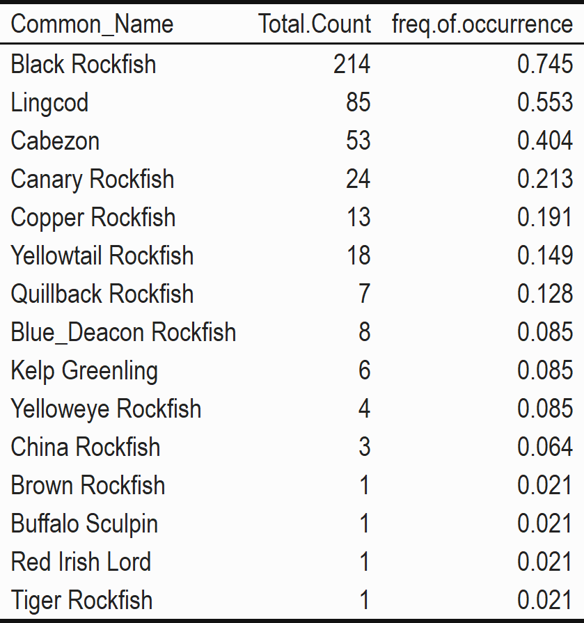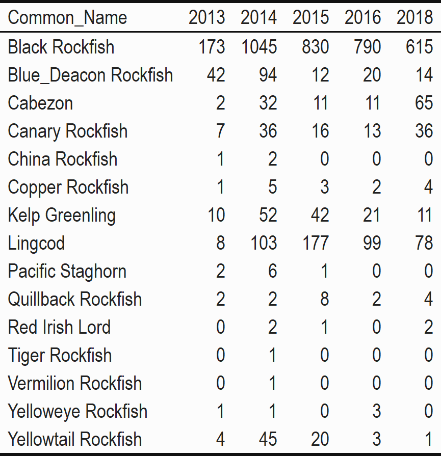 Data from hook and line surveys can be used to explore questions about fish abundance and size from a survey tool that is similar to local commercial nearshore hook and line fishing efforts. We can also explore these data with questions about diversity and community composition to compare across monitoring tools to understand tool bias or to validate trends seen across tools. This can further help us understand how the fish communities in these areas are similar or different. Data on abundance and size enable us to explore how fish catch, biomass, and size have changed over time; and whether these changes are similar both inside the reserve and outside in comparison areas. For all data our main focus is exploring trends by site and year.