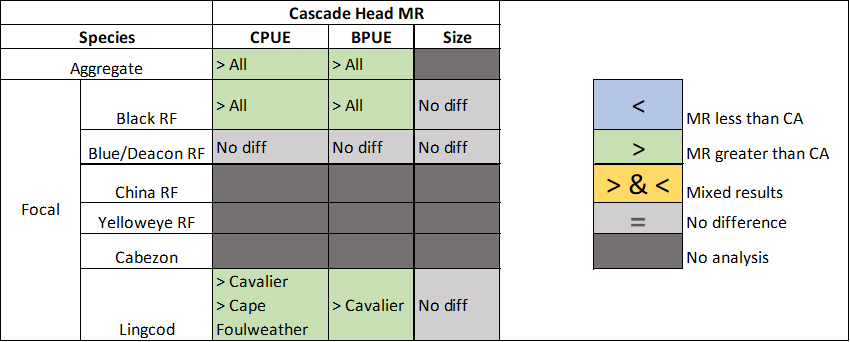 Hook and Line surveys (HnL) began at the Cascade Head Marine Reserve and two of its comparison areas, Schooner Creek and Cavalier, in 2013, before implementation of the marine reserve in 2014. Sampling is conducted in the marine reserve and three comparison areas, Schooner Creek, Cavalier, and Cape Foulweather (see methods Appendix for additional information about comparison area selection). Monitoring efforts resulted in four years of data for our analysis and inclusion in the synthesis report.