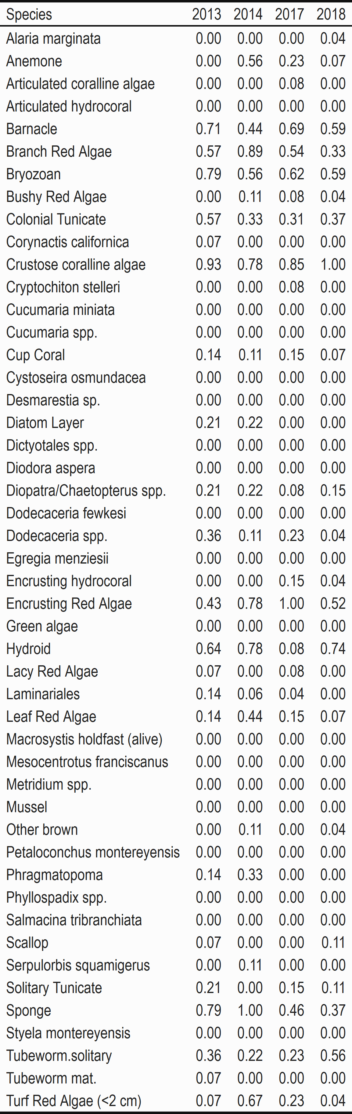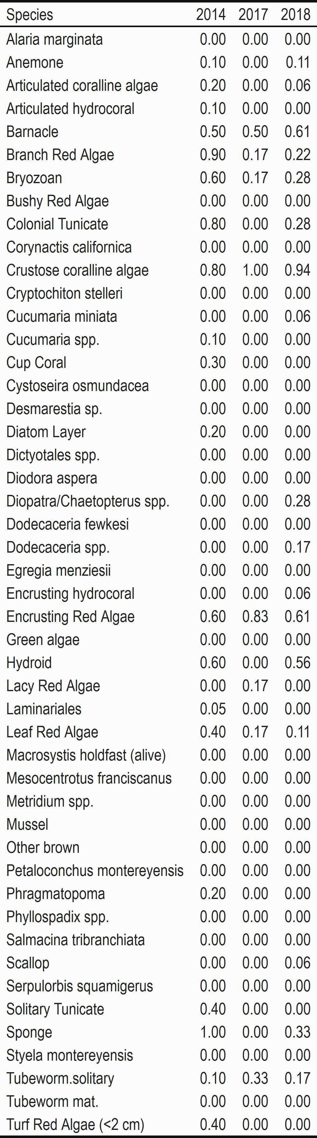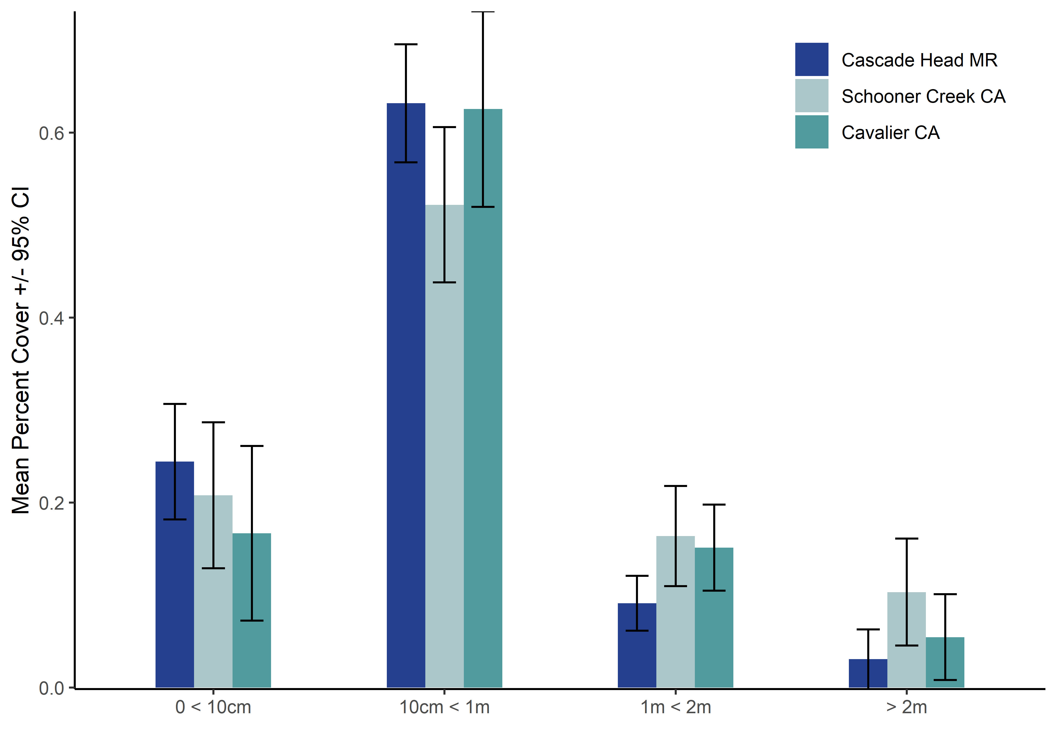 Our SCUBA benthic habitat sampling at Cascade Head began in 2013, one year before harvest restrictions began. Sampling is conducted in the marine reserve and two comparison areas, Cavalier and Schooner Creek (see methods Appendix for additional information about comparison area selection). We conducted four years of sampling that are included in our analysis and report. Note, sampling in Schooner Creek did not begin until 2014.