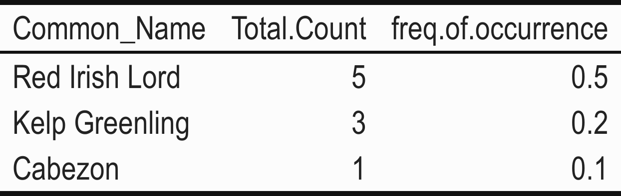 Of the three fish species observed at the Cape Falcon Marine Reserve on SCUBA, two were unique to the marine reserve - Red Irish Lord and Cabezon. Of the three species observed in the Moderate Fishing Pressure Comparison Area, two were only observed there - Black Rockfish and Buffalo Sculpin. The Red Irish Lord was considered common in the Cape Falcon Marine Reserve; but no species were considered common in the Moderate Fishing Comparison Area. No species were considered rare in either location due to low sample sizes.